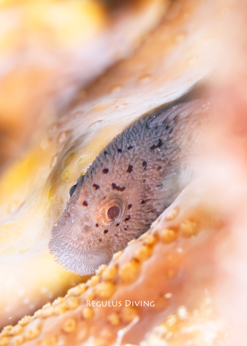 彼の住まいはサンゴの隙間なので、図鑑に載せられるような横位置の生態写真はなかなか撮らせてくれません。先日、台風前に一度一眼で撮ってみたのですが、やはりこんな仕上がりに。でも彼の性格がわかってきたので、次こそは横位置の写真を狙ってみようと思います。