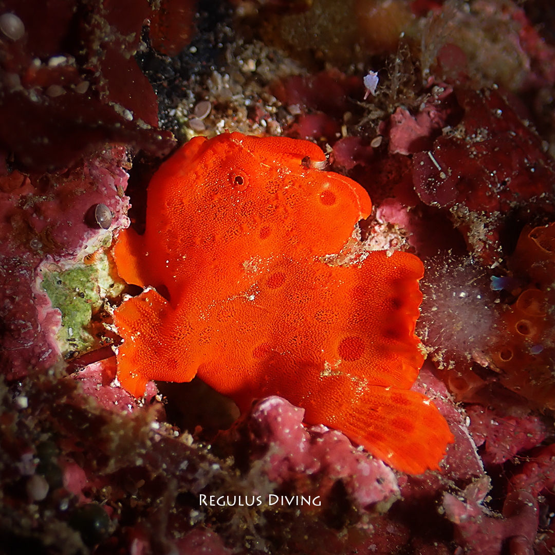 さらに遠くであおいがライトを振って呼んでいるので行ってみると、今度は10cmくらいのオレンジ色のイロカエルアンコウを発見。